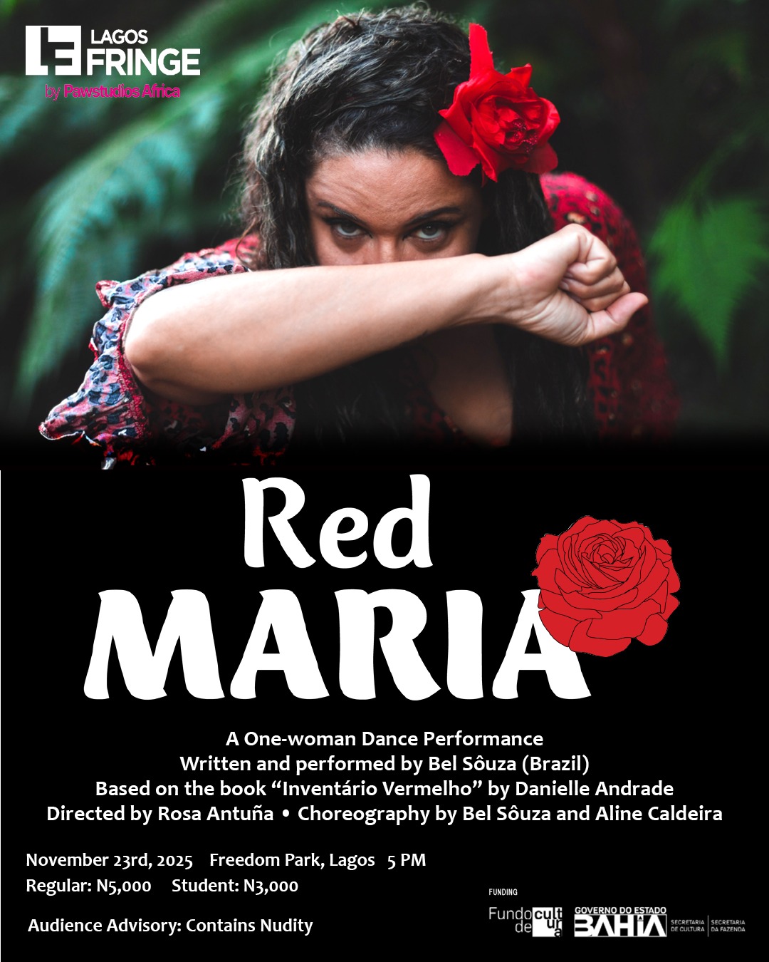 Red Maria, a solo performed by Bel Sôuza, is an intimate and visceral journey that transforms experiences of violence and oppression into acts of awareness, resilience, and resistance. The work calls upon the figure of Pombogira—an Afro-Brazilian spiritual entity who embodies desire, freedom, and the defiance of social conventions—interwoven with stories from Inventário Vermelho, a book organized by Brazilian writer Danielle Andrade.